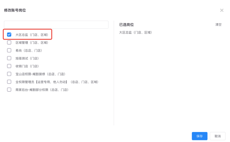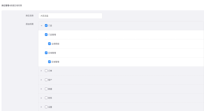 为岗位勾选区域类型权限意味着使用该岗位的区域管理者登录后有权管理区域后台,如果需要区域管理者同时有权管理区域下各门店的单独后台,可以继续为岗位赋予门店类型权限。