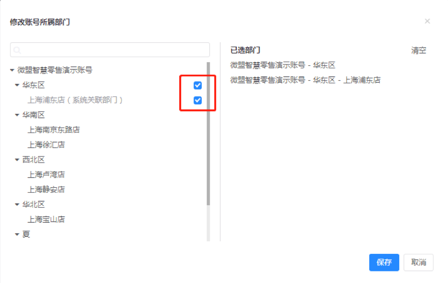 为子账号勾选相应部门(逐一勾选具体管理的区域及下属门店)