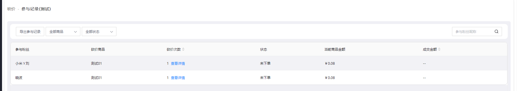 l 点击【参与记录】,在已编辑成功的活动中可查看“参与记录”,会显示参加砍价活动人员的具体信息。