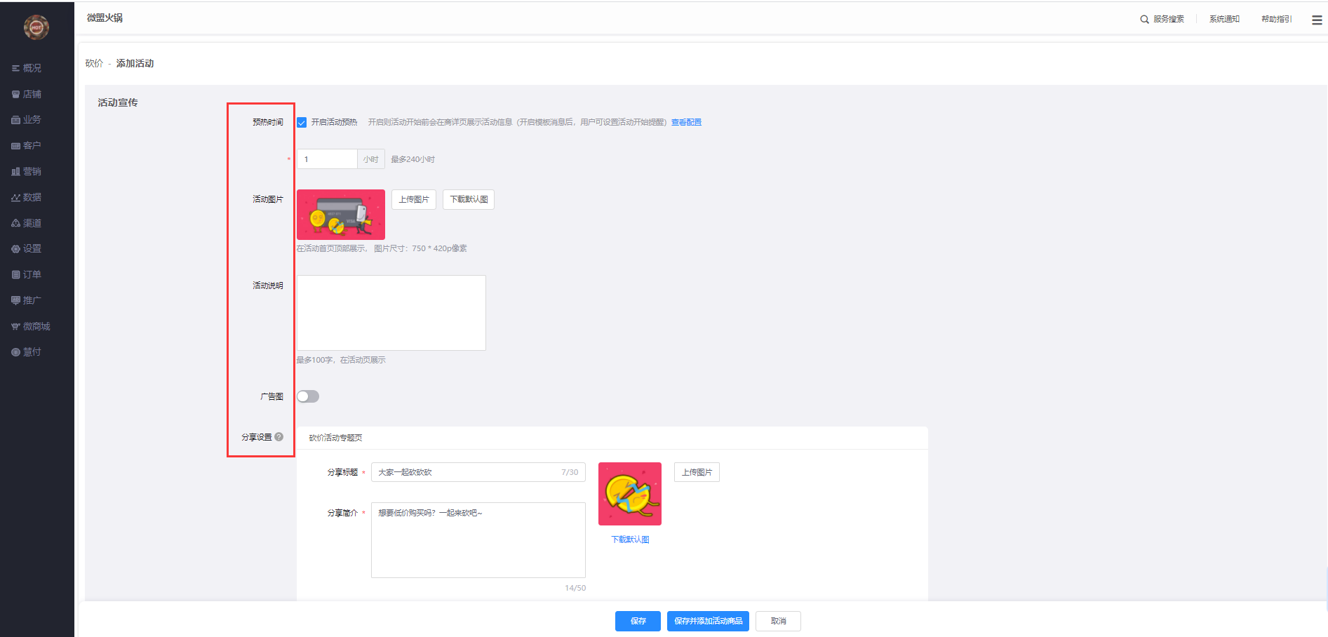 l 分享设置:添加活动标题、简介及图片后可进行“保存或保存并添加活动商品”。