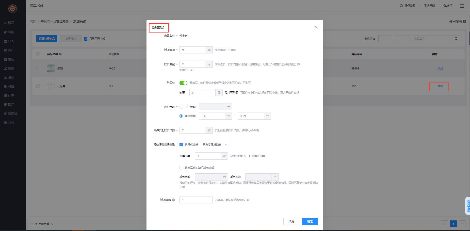 1.砍价活动商品为团购券、代金券形式,活动设置流程:设置团购券—上架至领券中心(可进行隐藏)—拼团活动添加商品;