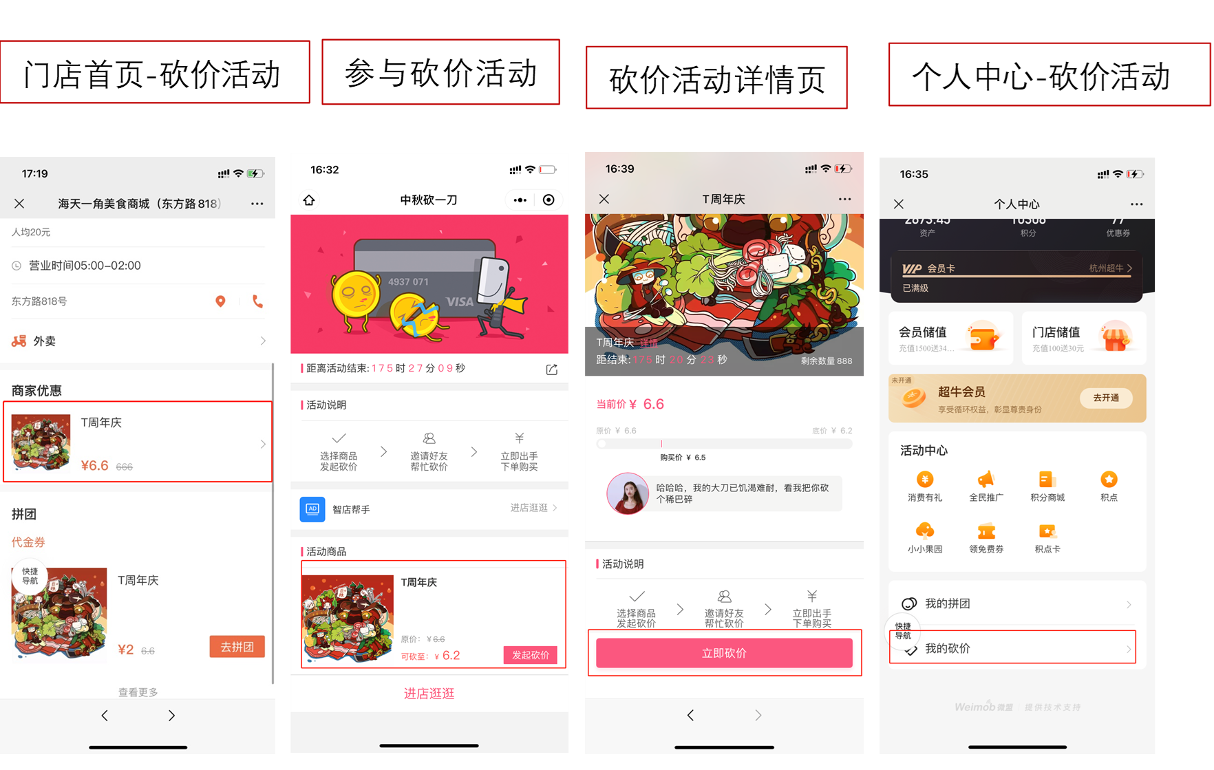 应用场景:某火锅店王老板由于疫情环境而导致的门店客流少的困境下,通过设置砍价活动以价格优势吸引用户,并主动分享,为火锅店带来新的客户,提高门店引流和销量。