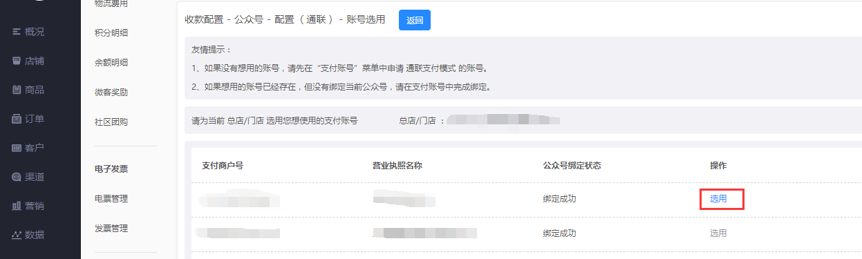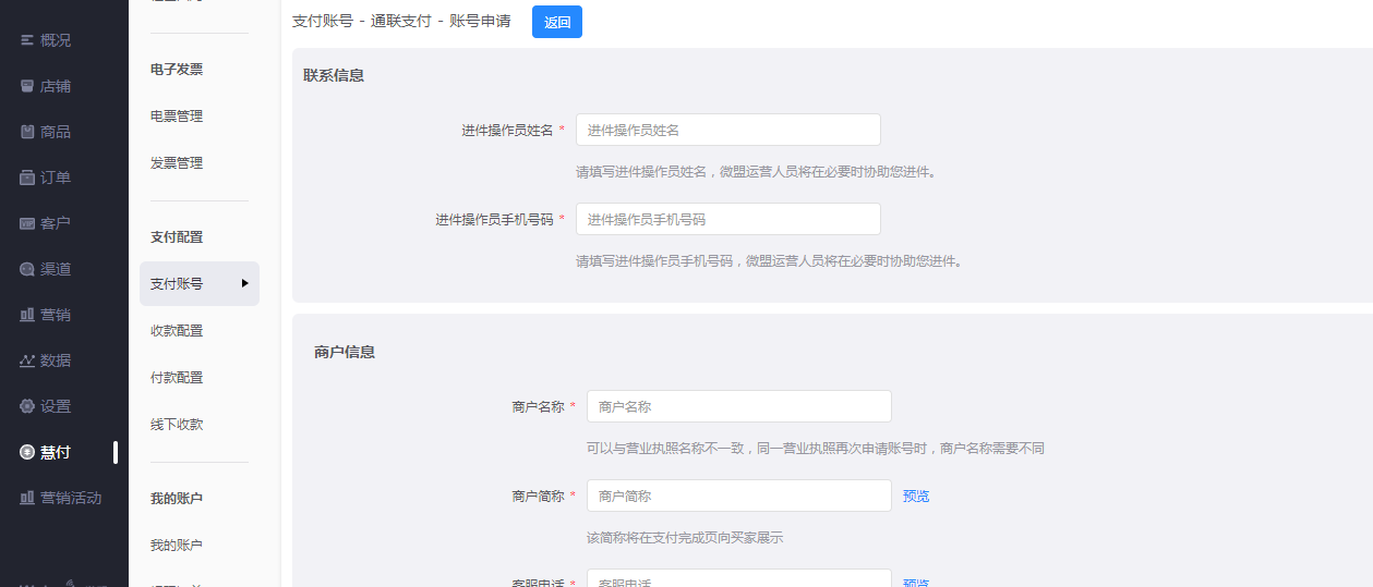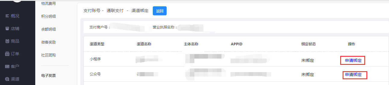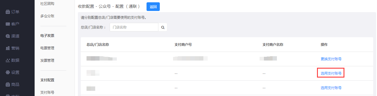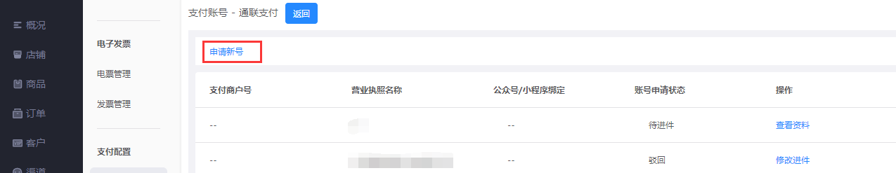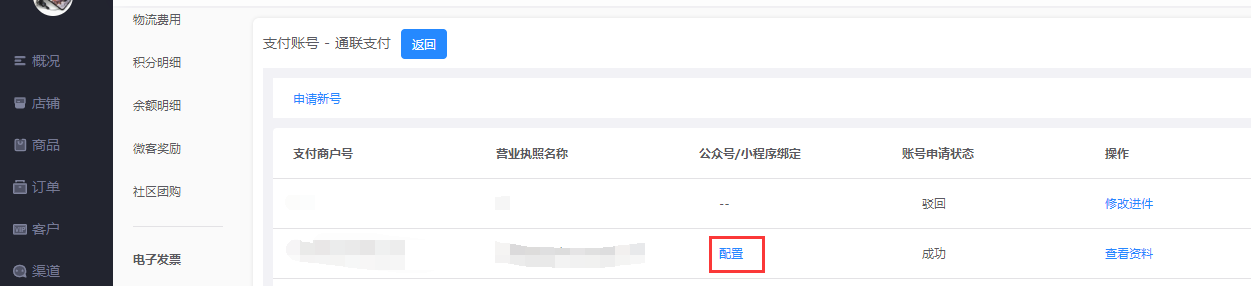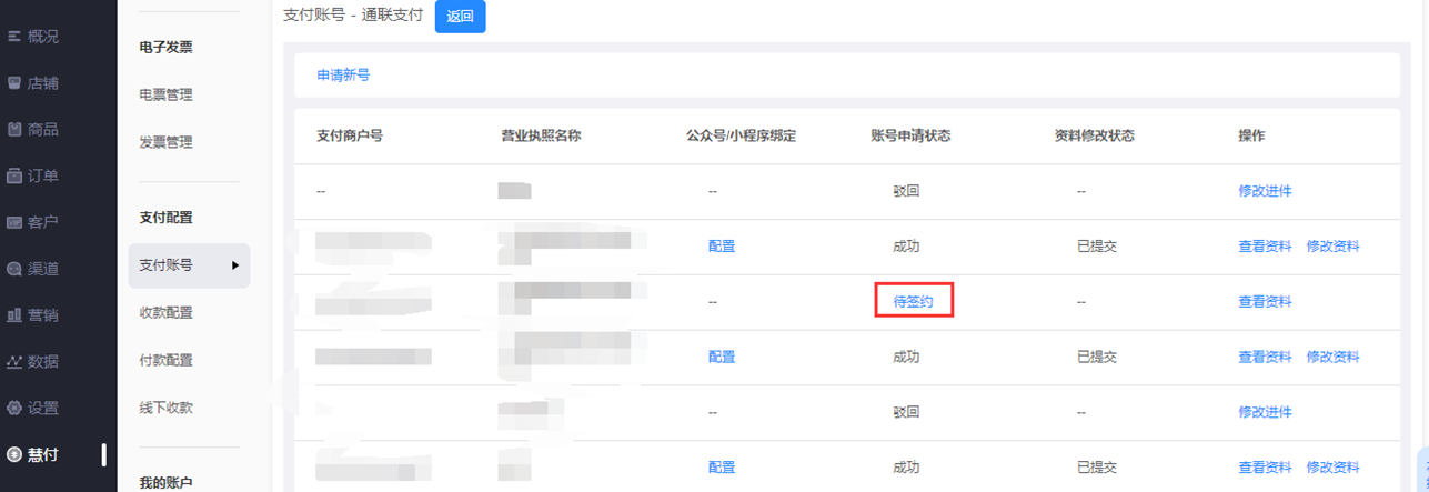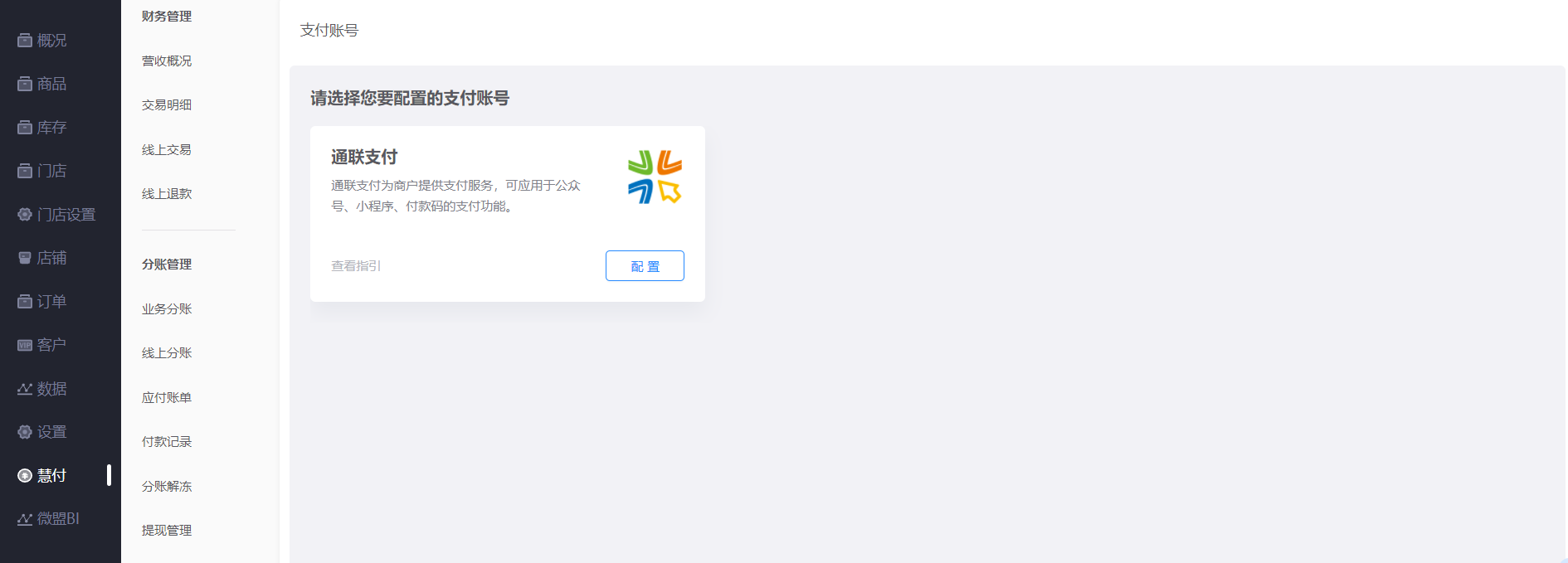 1)进入“慧付-支付账号”页面,找到“通联支付”,点击进入管理页面