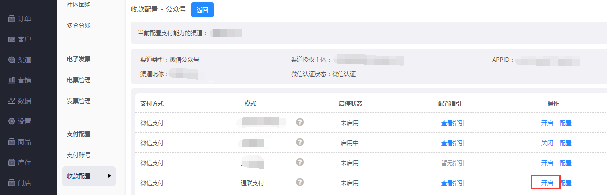 配置完成后,回到收款能力配置页启用“通联支付”模式即可,启用后,当前支付场景下已经配置了支付账号的总店/门店就可以进行交易收款了
