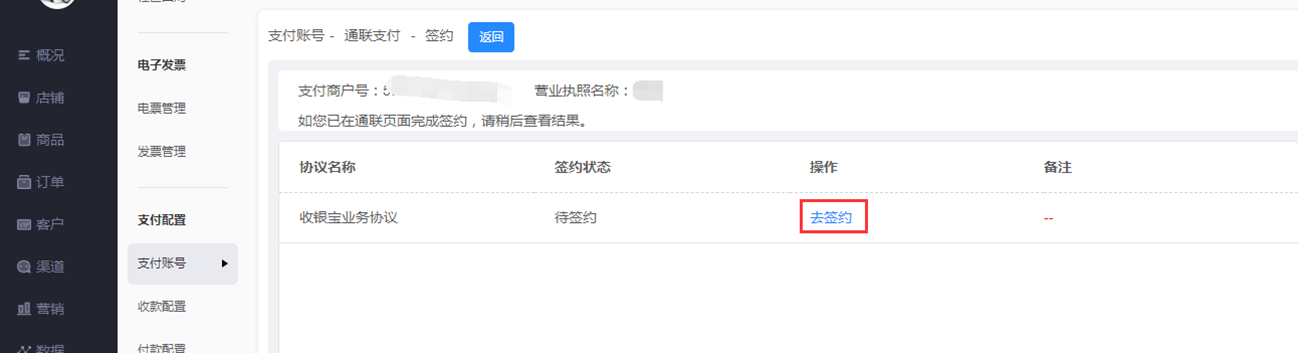 1)通联支付审核通过后,账号申请状态将更新为“待签约”,点击后,进入协议页面。