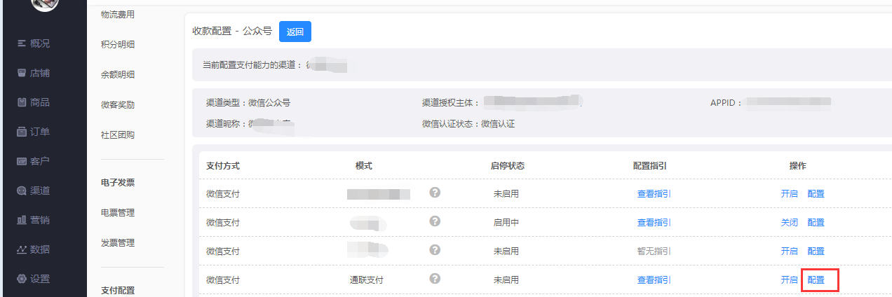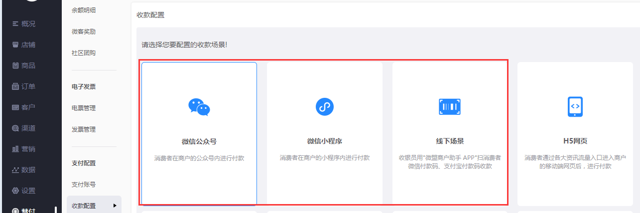 1)进入“慧付-收款配置”页面,选择相应的微信公众号/小程序场景