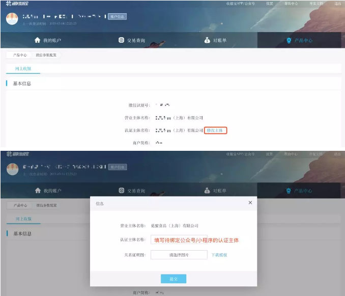 按以下步骤,将认证主体变更为微信公众号/小程序的主体