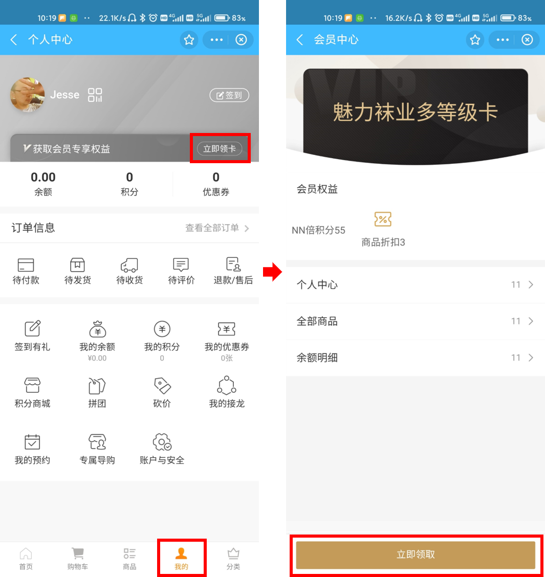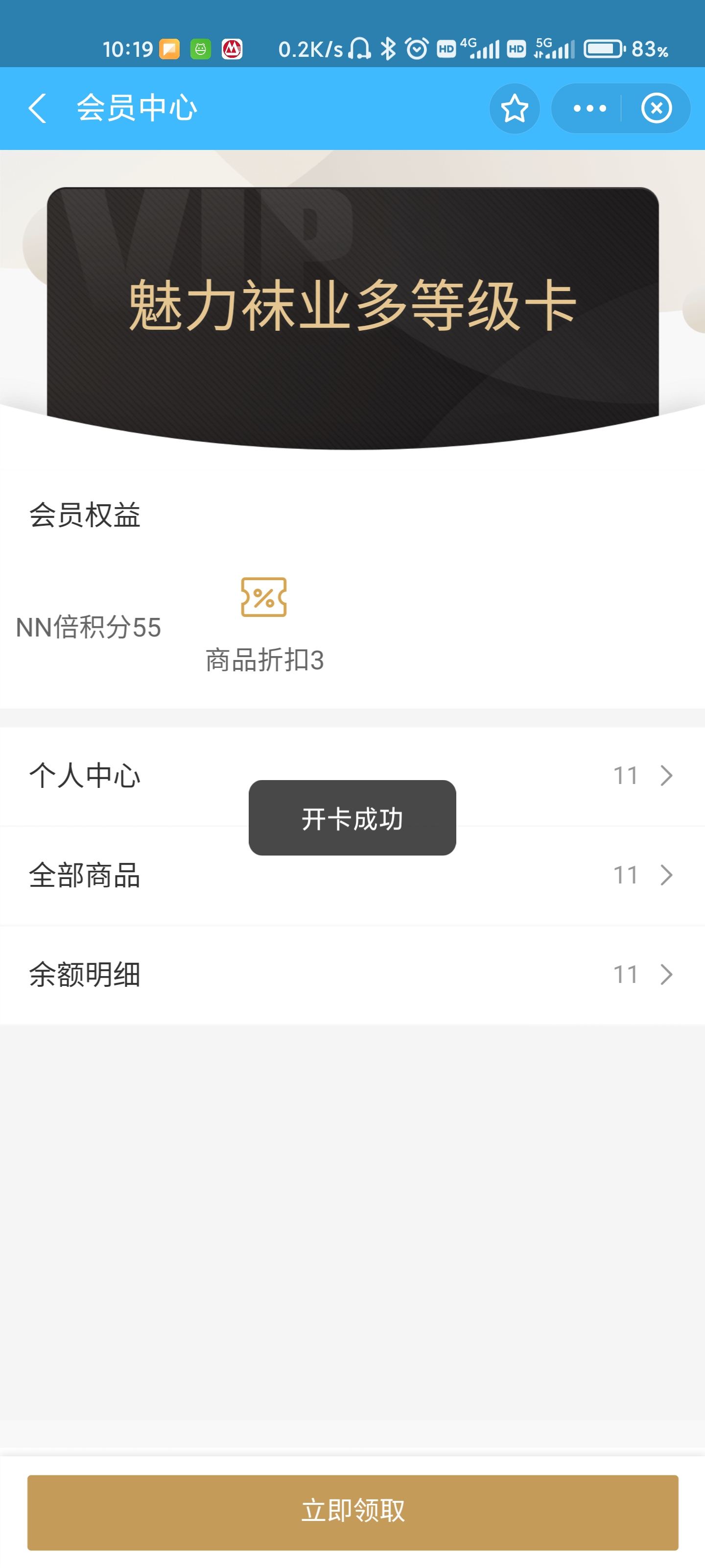 1.进入支付宝小程序-我的,点击领卡;在会员中心页面点击“立即领取”
