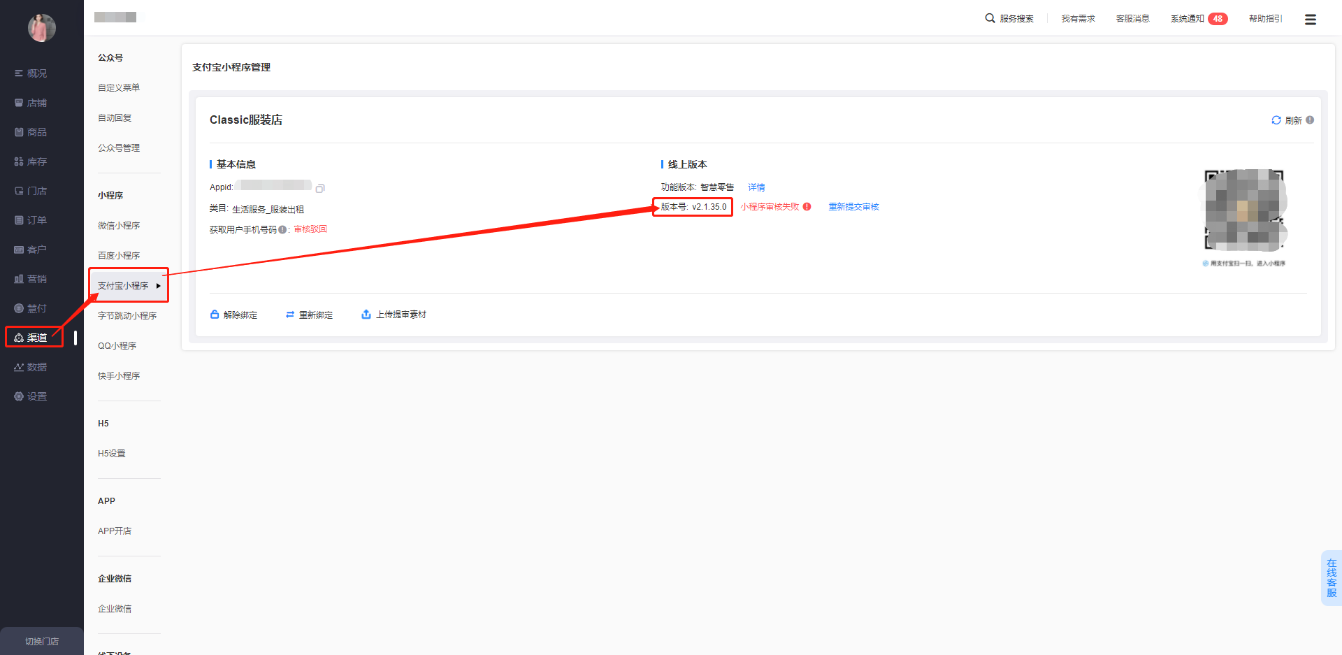 版本查看方式:微盟后台-渠道-支付宝小程序