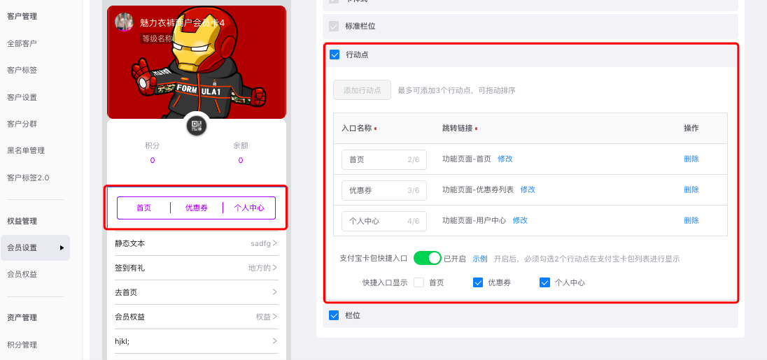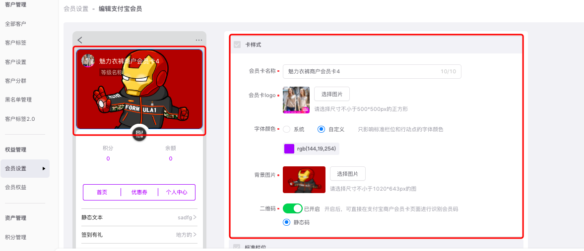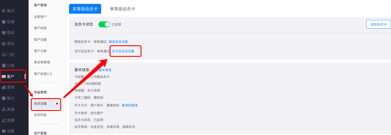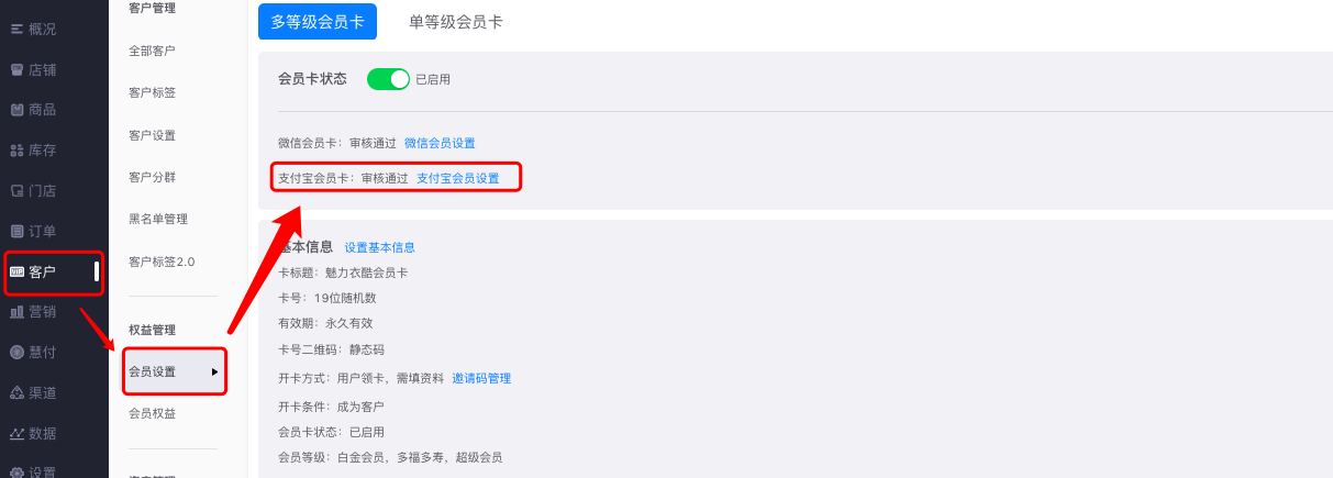 操作入口:客户-权益管理-多等级会员卡-支付宝会员设置