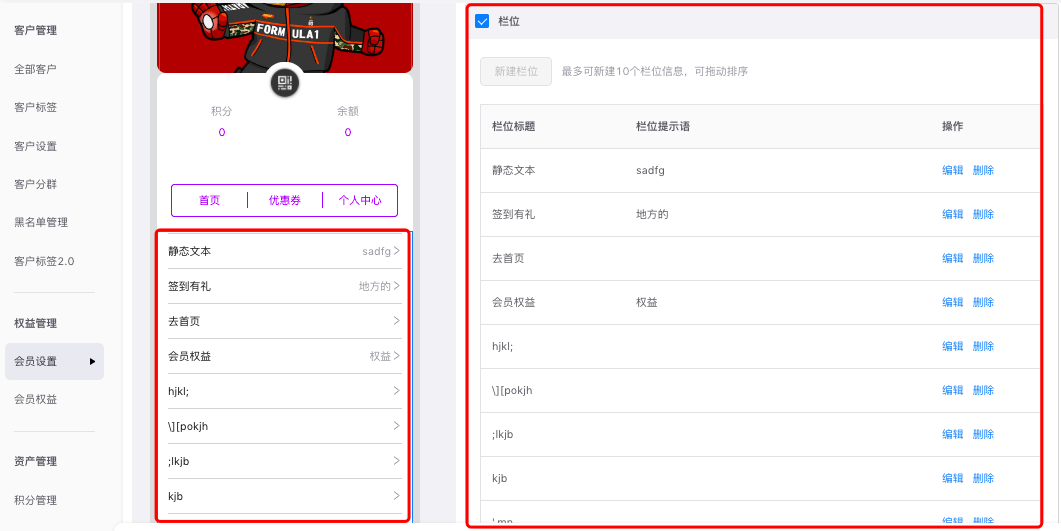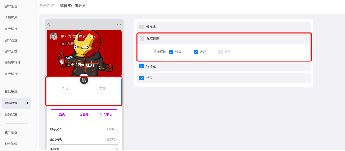 标准栏位默认开启,可勾选是否隐藏积分、余额,其中等级栏位默认开启并展示在卡样式模块;